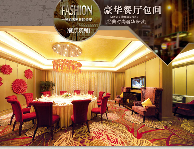產品簡介:酒店家具豪華餐廳包間,餐廳包間桌椅組合,專業定制各種豪華酒店家具,精裝豪宅家具等并提供裝飾設計。
