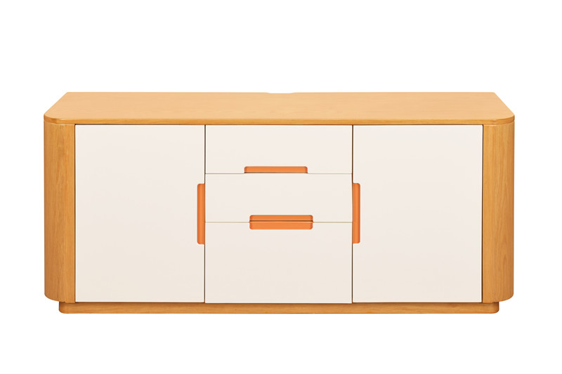 電視柜 基材:為實木白蠟木框架結構,臺面多層板貼白蠟木皮。 接觸面安全圓角,減低碰撞傷害,條狀暗拉手,抽面板用不同的色彩,是為了突出不同的作用。