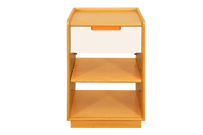 床頭柜 基材:為實木白蠟木框架結構,臺面多層板貼白蠟木皮。 三面起安全圍邊,防止物品易傾倒跌落,接觸面安全圓角,減低碰撞傷害,條狀暗拉手,抽面板用不同的色彩,是為了突出不同的作用